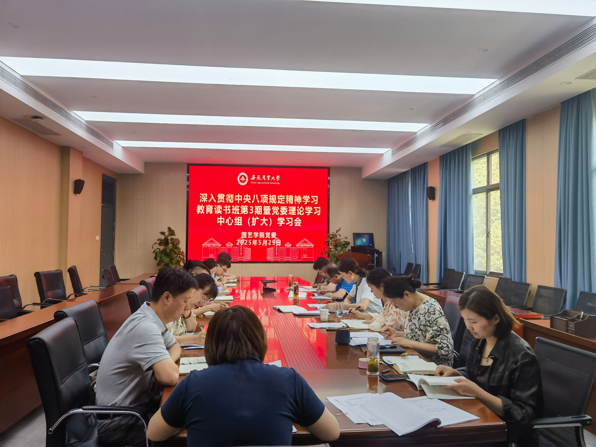 本网讯 5月29日上午,园艺学院在二教326会议室召开深入贯彻中央八项规定精神学习教育读书班第3期暨院党委理论学习中心组(扩大)学习会,学院领导班子、党委委员、党支部书记、科级干部参加会议,会议由院党委书记赵冠艳主持。
